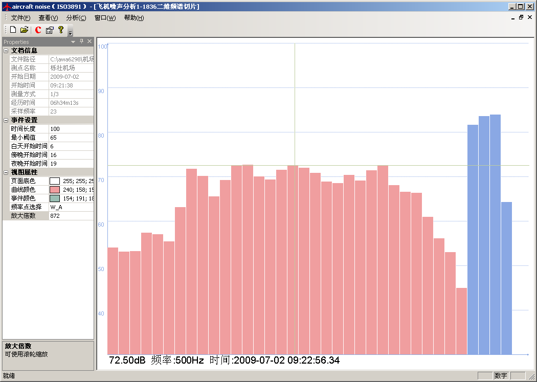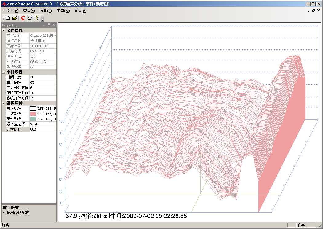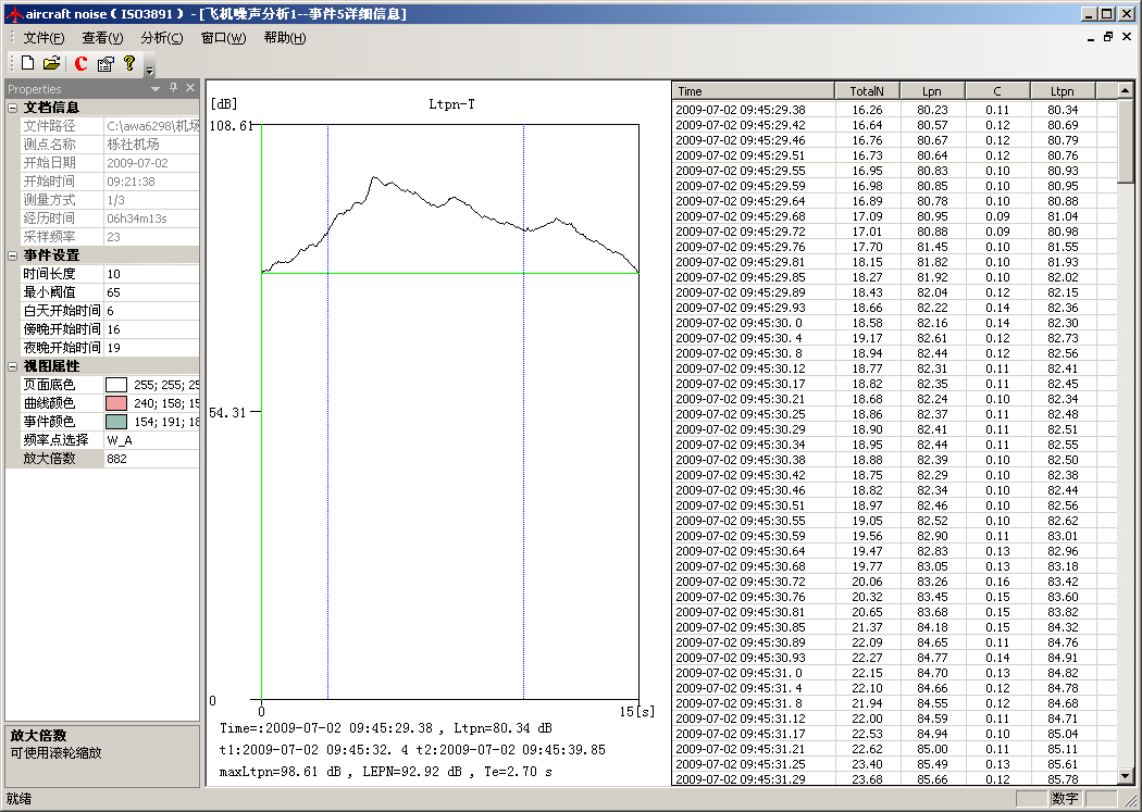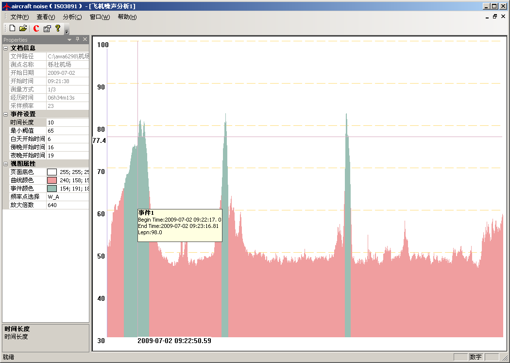 分析軟件可以根據(jù)用戶設(shè)定的判定依據(jù)自動判定出每一架次的飛行事件,按精密法或簡易法計(jì)算出每一架次的有效感覺噪聲級LEPN,再自動計(jì)算出全天的計(jì)權(quán)等效連續(xù)感覺噪聲級LWECPN。還可根據(jù)各測點(diǎn)的測量結(jié)果或預(yù)測結(jié)果自動繪制噪聲等值線圖,生成報(bào)告。
